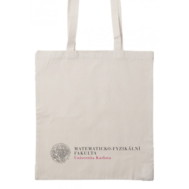Bavlněná taška s dlouhými uchy, materiál 140g/m2. Rozměry cca 39x43 cm. Přírodní barva. Potisk: dvoubarevné logo MFF UK