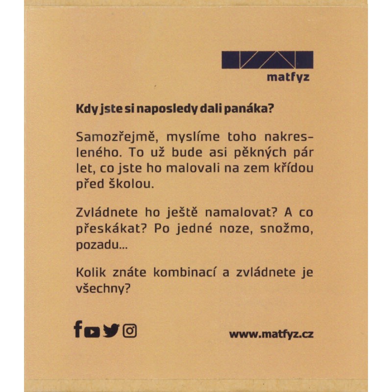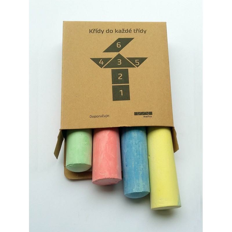 Kartonová krabička 95 x 110 x 25 mm s potiskem. Potisk přední i zadní strany (viz obrázky). Obsahuje čtyři barevné křídy o průměru cca 22 mm. Nakreslete si co chcete a kam chcete, jen ne na buvovy fakulty!
