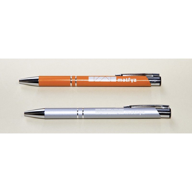 Celokovová kvalitní propiska, modrá náplň, tenká čára. Laserované logo Matfyz.